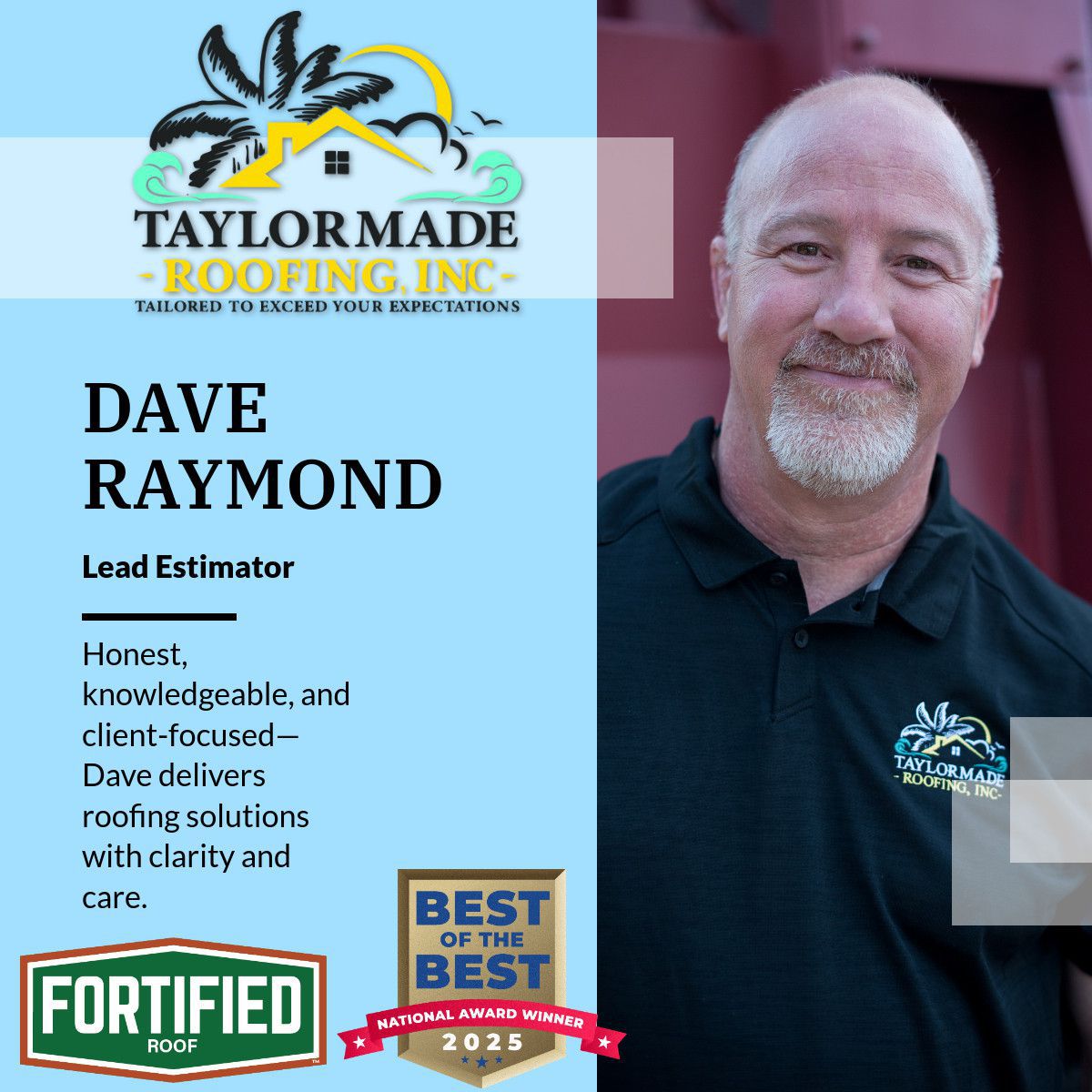 Dave Raymond plays a key role in helping our customers navigate their roofing projects with confidence and care. As part of the TaylorMade team, Dave is known for being dependable, knowledgeable, and always focused on doing what’s best for the homeowner.